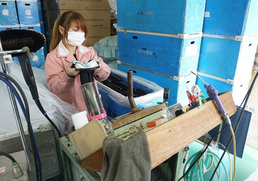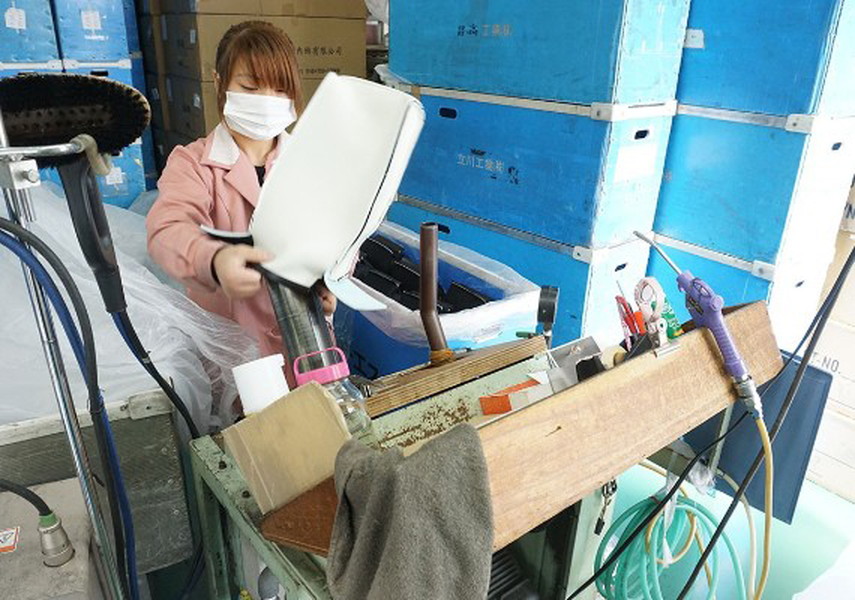 布製品の組み立てに、エアーで吸い込む機械を使用しています。一つ一つ品質を確認しています。